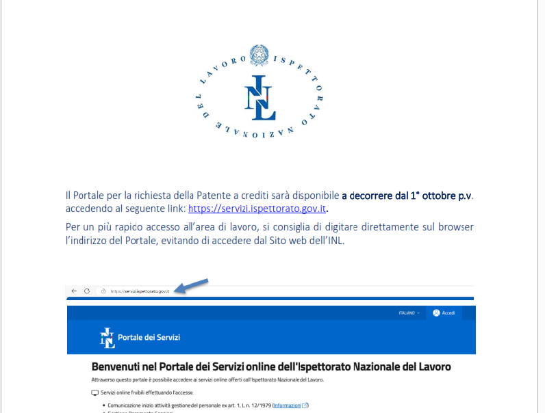 Istruzioni per accedere al portale di richiesta della Patente a Crediti (fonte Ispettorato Nazionale del Lavoro)